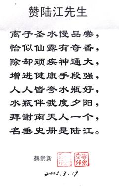 3. 詳細了解請上網(wǎng),可見臨床報告,鑒定證書、專家評說、治病機理、用戶反饋、題詞、詩歌、錦旗等彩色掃描件,被譽為"神奇水瓶"。