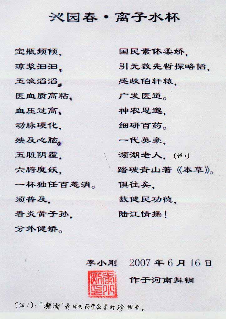 1. 本品倒入熱的或冷的開水,處理成富含4-6個水分子小簇團的微小分子團水。飲用后祛除上述疾病,包括各期原發(fā)性高血壓、單純收縮期高血壓、老年性高血壓、中過風和做過"搭橋"或"支架"的冠心病患者。