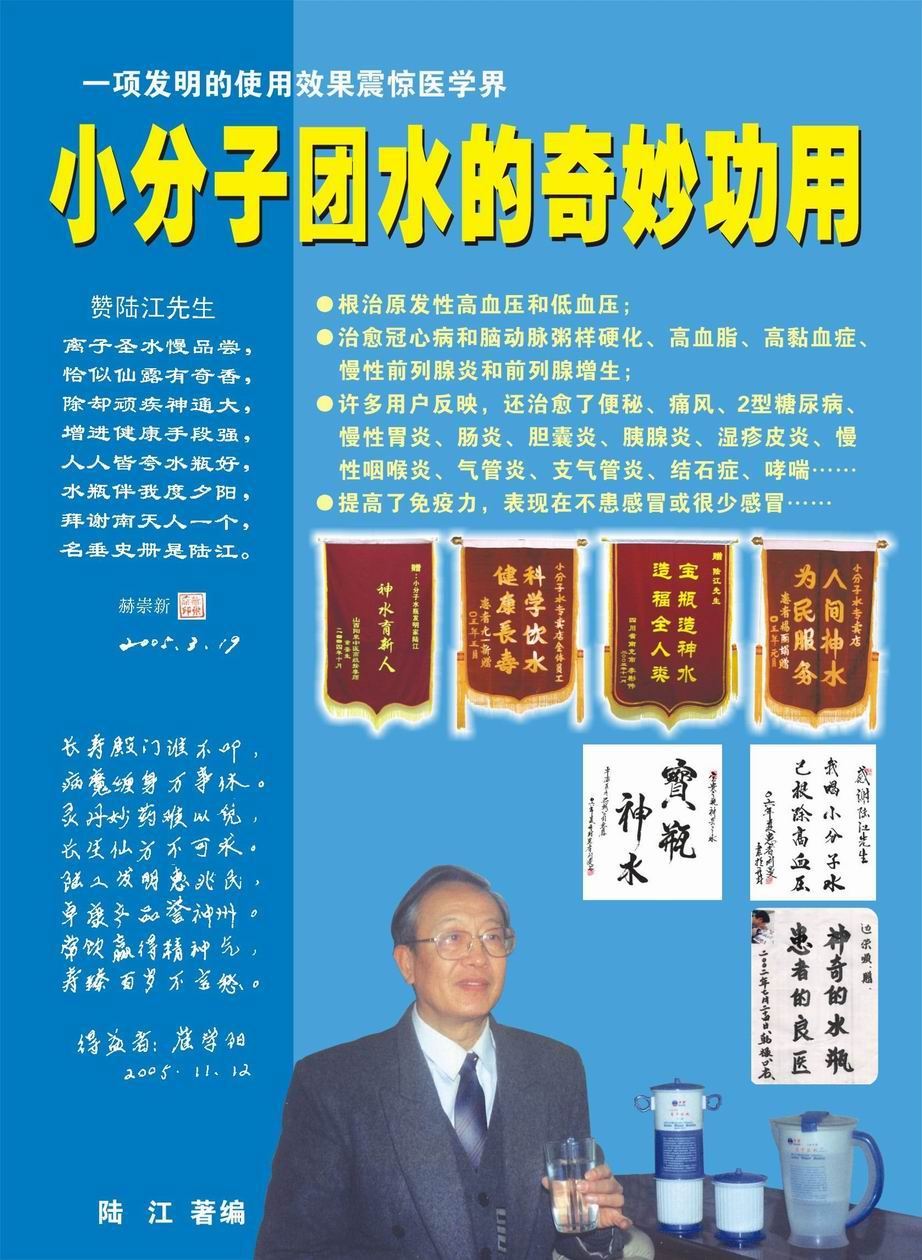人類幾千年來患以上病癥需終生服藥,幾十年也不能治愈。可是我國南寧的高級工程師陸 江,于1990年想根治高血壓,研究發(fā)明了離子水瓶,處理出微小分子團水供飲用,經(jīng)過醫(yī)院臨床試用和專家鑒定,1999年獲中國發(fā)明專利權(quán),產(chǎn)品于2000年投放市場后一直跟蹤調(diào)查,據(jù)全國各地用戶反饋:祛除了高低血壓、糖尿病和冠心病,并使前列腺增生、咽喉炎、鼻竇炎、慢性氣管炎、支氣管炎、矽肺病、哮喘、慢性胃炎、腸炎、慢性膽囊炎、慢性腎炎、腎衰、膀胱炎、便秘、痔瘡、風濕性關(guān)節(jié)炎和濕疹皮炎及中風后遺癥等病癥不藥而愈。為什么喝微小水能治20多種病?陸 江從1991年德國科學家發(fā)現(xiàn)細胞膜水通道僅為2納米獲得啟發(fā),認為多種器官患病是因細胞脫水,不能正常代謝和分裂增殖,才使器官細胞減少致衰弱萎縮而形成細胞缺水性病癥。22年來的實踐有力地支持了“細胞脫水致病”這一重要論點,表明喝微小水可滿足細胞的生理需求,補水就能祛病,是生命科學新亮點。