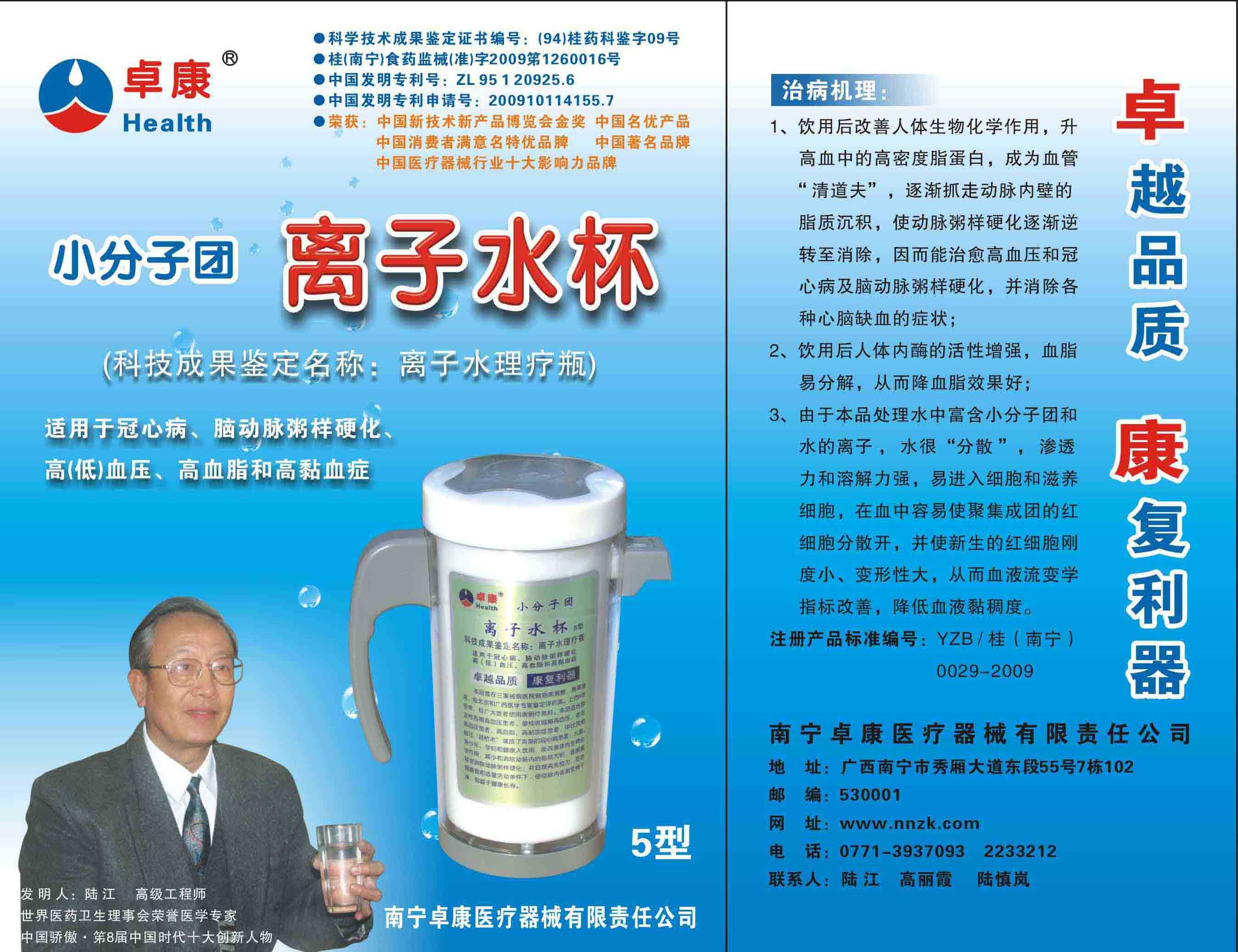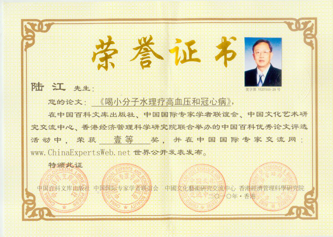 -----我是從事建筑的高工,本來沒有資格去攻克醫(yī)學難題,卻為了自身健康才扣響醫(yī)學的大門。由于我1990年患高血壓,因怕中風才研究發(fā)明了離子水瓶,我把水處理成微小分子團水,飲用后治愈了高血壓。便于1993年底送到三家省級醫(yī)院做臨床試用4個月。經(jīng)北京和廣西醫(yī)學專家鑒定:"降脂降壓效果好"," 能擴大心腦動脈流量,改善心腦電圖以及微循環(huán)","對治療心腦動脈粥樣硬化、高血壓、高血脂有良好的醫(yī)療保健作用。""產(chǎn)品的技術(shù)性能和療效達到了同類產(chǎn)品的國內(nèi)領(lǐng)先水平,經(jīng)廣西醫(yī)學科學情報研究所檢索,未見國外有類似報道。"中國醫(yī)學科學院張正國教授從美國國立醫(yī)學圖書館數(shù)據(jù)庫存Medline檢索英俄文資料,均未見類似報告。2000年上市后,我為了對消費者負責而繼續(xù)觀察研究,一直通過《信譽卡》和《質(zhì)量跟蹤調(diào)查書》向患者承諾療效,請用戶使用6個月后反饋效果。和脂壓患者飲用2至5個月內(nèi),消除癥狀,停服藥物,血壓正常;冠心病患者飲用3~5個月逐漸減輕至消除心絞痛、房顫等癥狀,不再服藥,飲用1年左右心電圖正常,經(jīng)冠脈造影掃描無明顯狹窄,表明冠心病痊愈。大量患者還反映許多衰弱器官被修復,讓前列腺增生、慢性咽喉炎、慢性氣管炎、支氣管炎、慢性胃炎、腸炎和膽囊炎等不藥而愈;2型糖尿病患者是因為胰島衰弱致病,飲用該水半年至一年,逐漸減藥至停藥,血糖尿糖正常,真正治愈2型糖尿病。中風后遺癥患者飲用六七個月,可逐漸減輕至消除肢體和語言障礙,表明飲用該水能讓壽命很長的神經(jīng)元細胞逐漸修復,奇跡般地恢復肢體和語言功能。飲用后還使胸腺和脾臟兩個重要的免疫器官被修復和增強,產(chǎn)生免疫細胞多,提高了免疫力,使人不生病或少生病。自此, 飲用微小分子團水創(chuàng)造了攻克冠心病、高(低)血壓和糖尿病三大醫(yī)學難題的奇跡。人們對此感到不可思議,但實踐是檢驗真理的唯一標準。